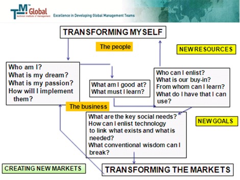 • In the upper loop, you transform yourself, by looking inward and defining for yourself your dreams and your passions, and your skills, and how you must change in order to achieve them. And entrepreneurs always must change and adapt if they are to succeed.