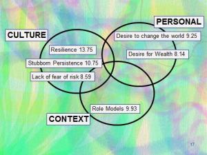 Three of the top five innovativeness factors are “cultural” in nature, deriving from Israeli culture: Resilience, stubborn persistence and lack of fear of risk. One is contextual (role models – other Israeli entrepreneurs who have done great things), and one is ‘personal’ but with a strong cultural element (desire to change the world). It is interesting that army experience in both technology and leadership, cited as strong factors by Start-Up Nation, ranked 11th and 12th out of 13. This may in part reflect that respondents are chip designers, a technology not central to IDF R&D efforts.