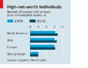 An annual survey estimated that the combined wealth of the world’s 10.9m rich people (27% of whom are women) stood at $42.7 trillion in 2010, more than in 2007, the year the financial crisis was brewing. More than half of the monied classes live in the United States, Japan and Germany, though Asia has more in total than Europe for the first time.