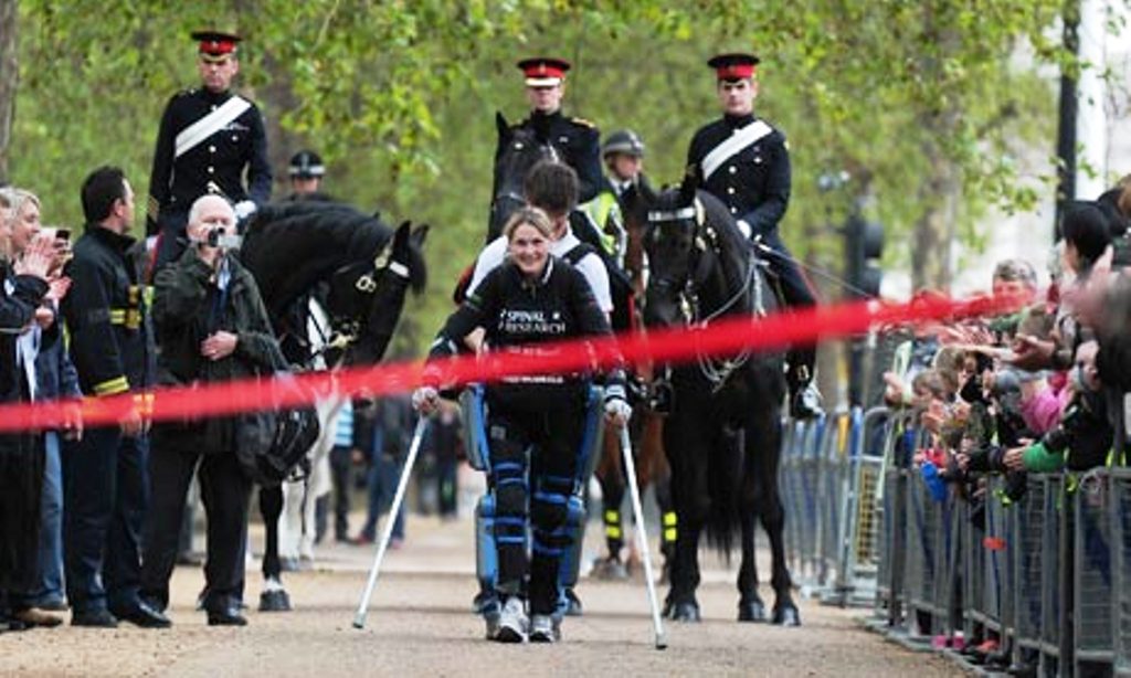 But the greatest marathon record by far is that set recently by Claire Lomas:  384 hours, or 16 full days.  She walked across the finish line of the London Marathon, accompanied by three riders from the British Household Cavalry.  (see photo).    The reason this is amazing?  Claire’s legs are paralyzed.   She was injured in a horse-riding accident.  She was able to complete the full 26-mile 200 yard marathon course ON HER OWN TWO FEET thanks to an Israeli invention called ReWalk, an ‘exo-skeleton’ invented by Dr. Amit Goffer, an Israeli entrepreneur.