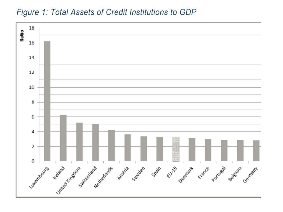 You know you are in trouble when the tail starts wagging your dog. And – when the banks are much bigger than the countries in which they reside. The chart above * shows bank assets as a fraction of the GDP of the nation in which they function. Not shown are: Cyprus (7.2 times GDP) and Malta (7.9 times GDP).