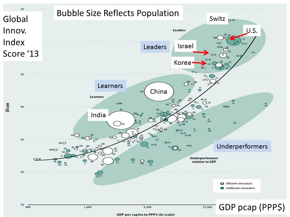 The size of the circle measures population size. Note that the shading of the circle is significant: white means “efficient” (innovation resources are used efficiently to generate innovation outputs) while blue means “inefficient”. The U.S. circle is shaded blue, as is that of Japan and Hong Kong.
