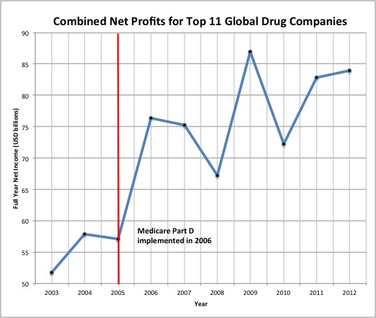Wrong. Here is how two eminent doctors (1) debunk that number. And at the same time, prove that “pharmaceutical companies are price-gouging”, with the biggest 11 pharma firms piling up ever-rising net income – nearly $85 b. in 2012.