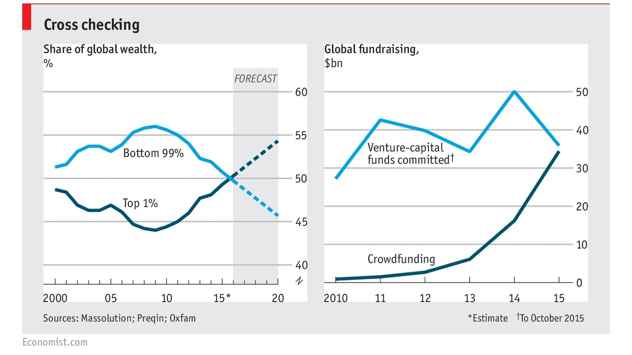 Second, also for the first time, crowdfunding, as a source of funds for startups and new ventures, will catch and exceed conventional venture capital. This is a major disruptive change for the large VC industry, and it is a change that has happened with incredible rapidity – from zero crowdfunding, essentially, in 2010, to $35 billion in 2015. It implies a different business model for startups, which now must tailor their messages more toward “crowds” than toward perspicacious (and sometimes, supercilious) venture investors. Along with the rise in crowd-funding comes the rise in angel investments, funded by wealthy people who are willing to take bigger risks with their money (and achieve higher returns) than with conventional financial assets.