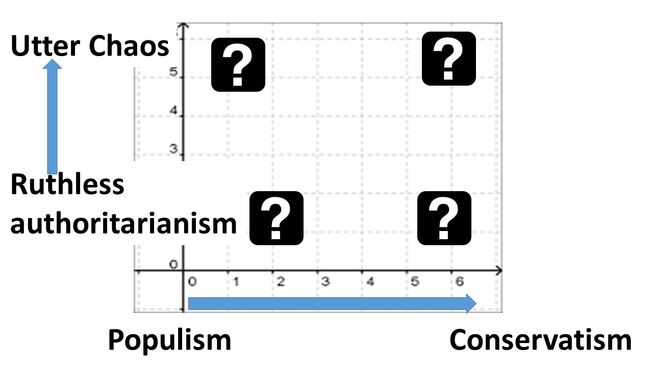 On the X axis, place Trump’s policies. They can run from populism all the way to conservatism. Populism would involve spend-spend. Conservatism would involve cut-cut, put government at all levels on a starvation diet. Where will the Trump administration be?
