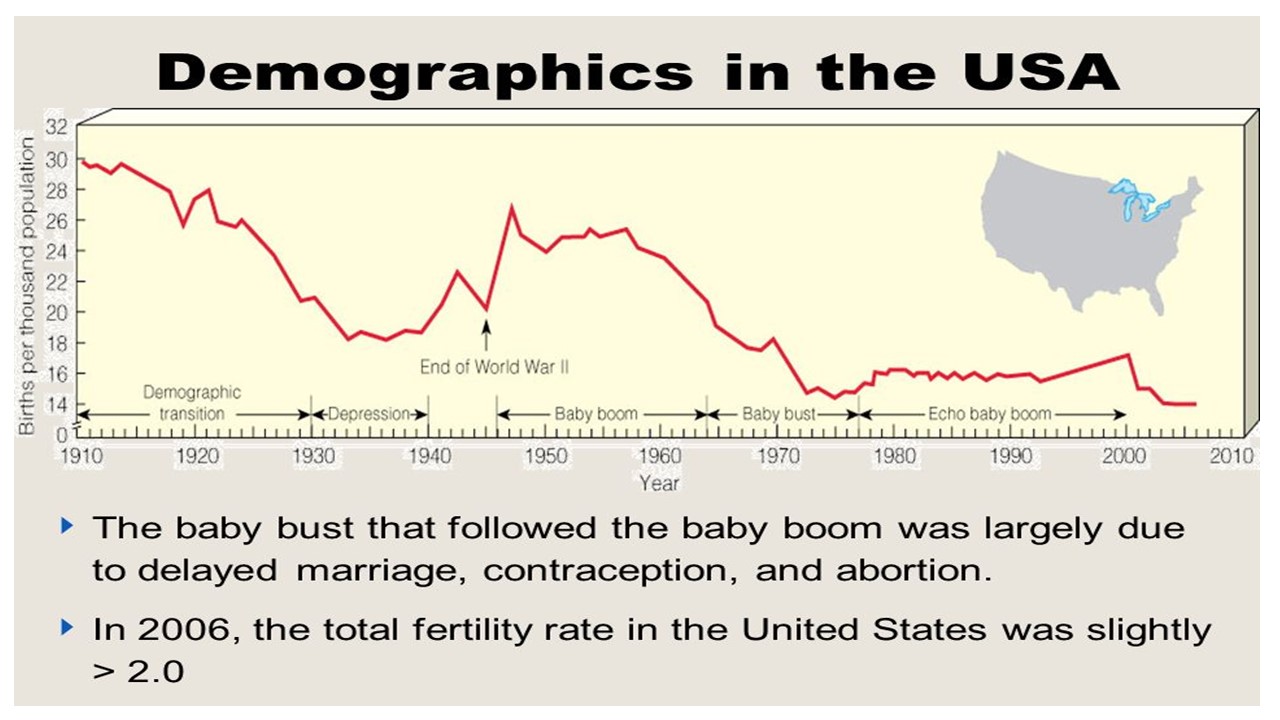 Demographers know that the ‘demographic transition’ (sharp fall in fertility as countries grow wealthier) happens everywhere. But the ‘baby bust’ has followed a huge baby boom, that brought economic growth to the US. Baby busts do the opposite.