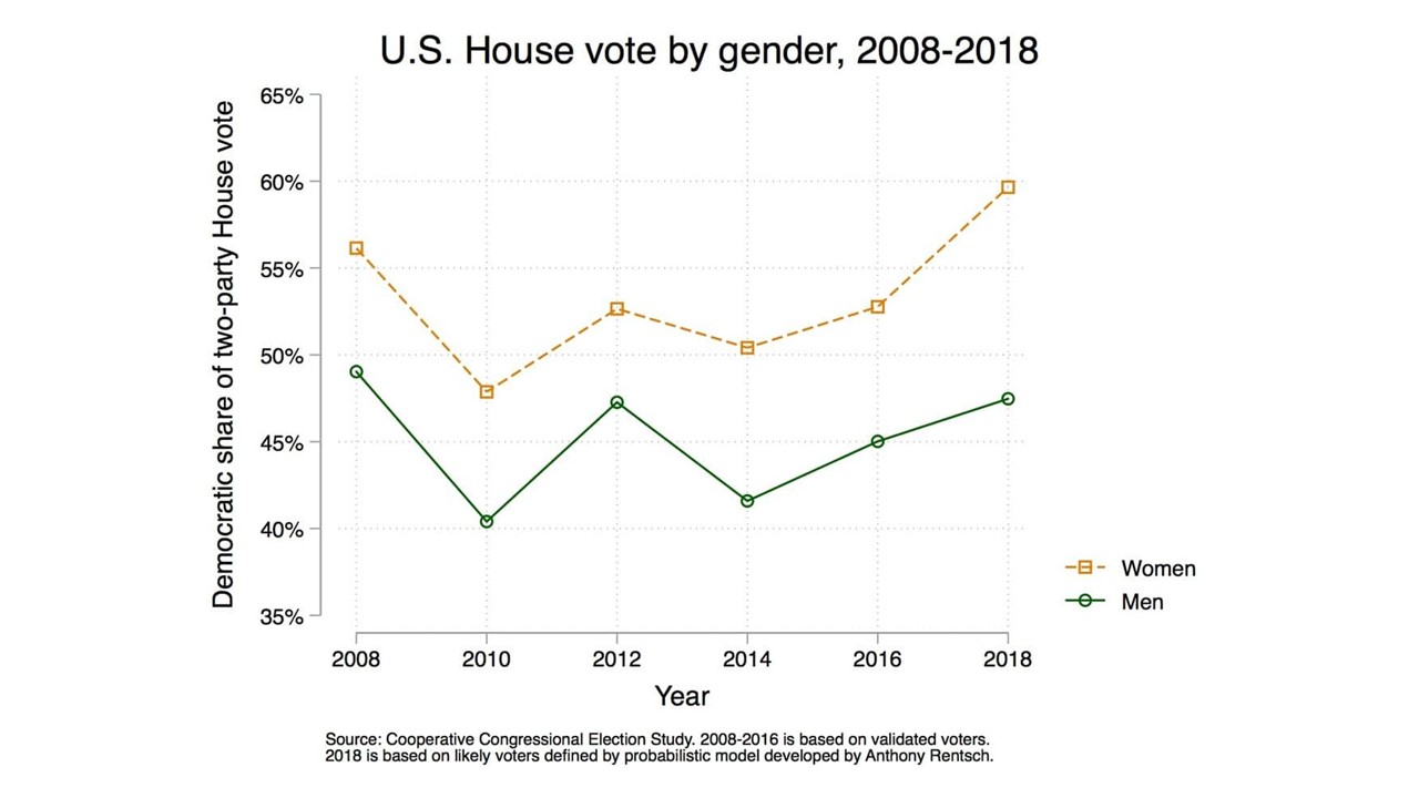 Top figure: % voting Democrat, mid-term (Nov 6) House of Representatives, by gender. Women: 66% (2/3). Men: 50% (1 in 2). Huge difference.