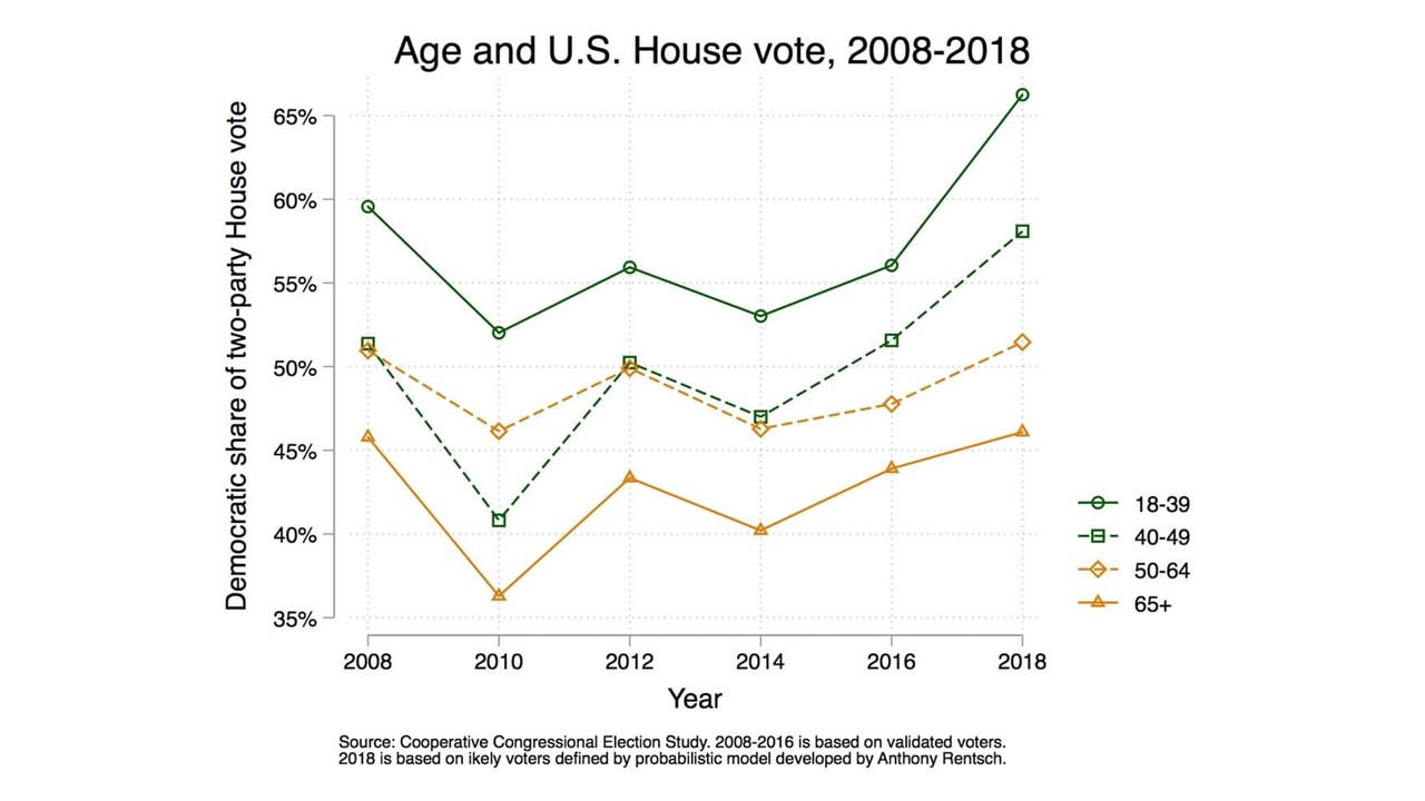 Middle figure: % voting Democrat, by age. Young (18-39) 66%. (2/3). 65 and older: 45% (less than 1 in 2).