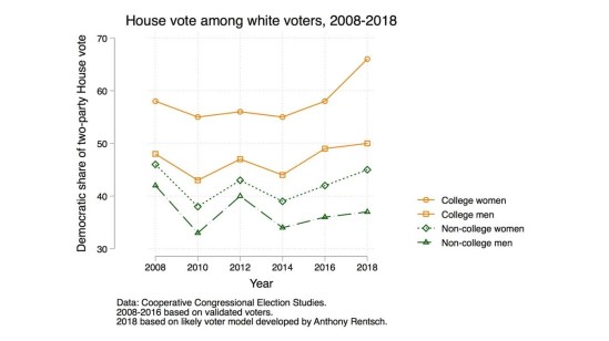 * Source: Washington Post, Brian F. Schaffner, Nov. 10. “….these charts are based on data from the Cooperative Congressional Election Study (CCES), a large-scale academic survey conducted in every election year since 2008. For the 2018 CCES analysis, we used pre-election interviews with respondents weighted to be nationally representative of the adult population. We then applied a likely voter model trained on previous election cycles to create estimates for the 2018 electorate.”
