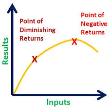 As an economics student, many years ago, I was taught that production (both industrial and agricultural) was ruled by a Law. The Law of Diminishing Returns. (See diagram). The more effort you invest in something, the less and less additional output you get. This law originated in agriculture. For a given plot of land, the output of food it produces rises by less than the labor and resources invested in it. Here is the proof: If there WERE increasing returns, you could grow all the world’s wheat in a flowerpot. The same “law” translated as well into industrial production.