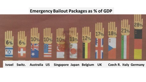 According to the International Monetary Fund, Germany’s bailout package is fully 28% of GDP! And Germany guarantees 90% of emergency loans. All this, to keep businesses afloat, so they can bounce back.