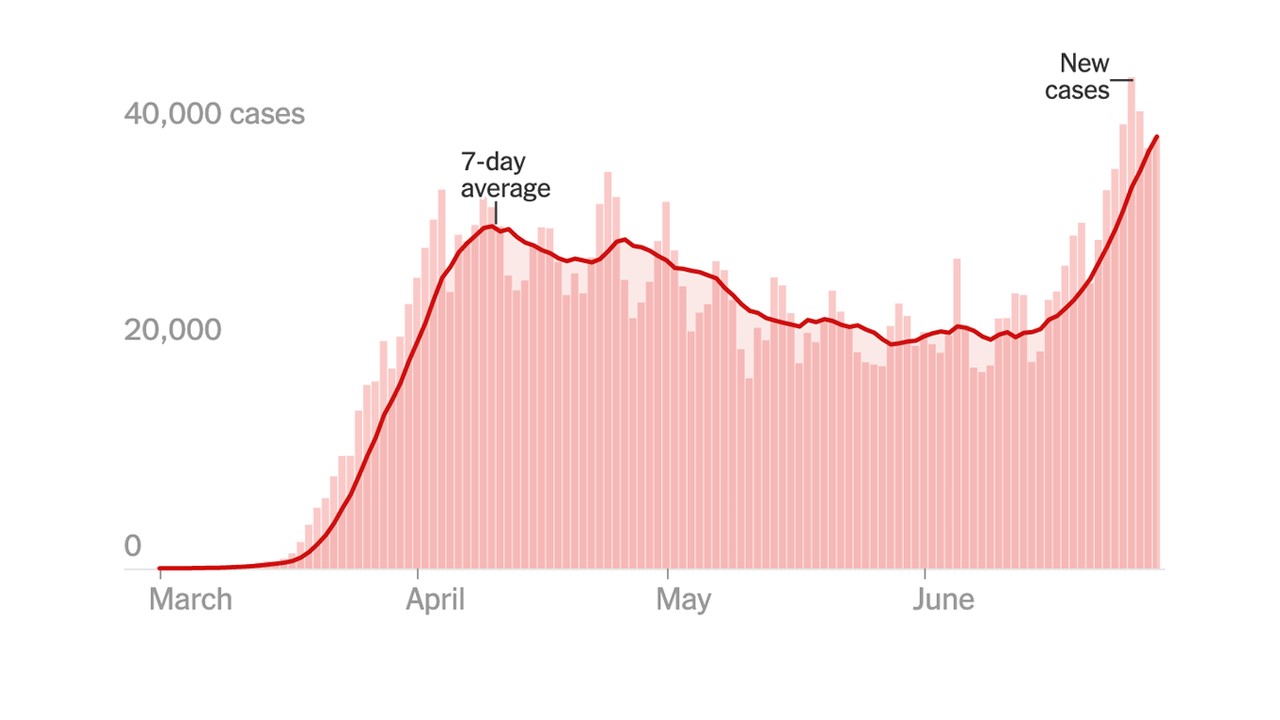 The graph above shows new COVID-19 cases daily, for the United States, up to date. It speaks for itself. (The graph is from the New York Times).
