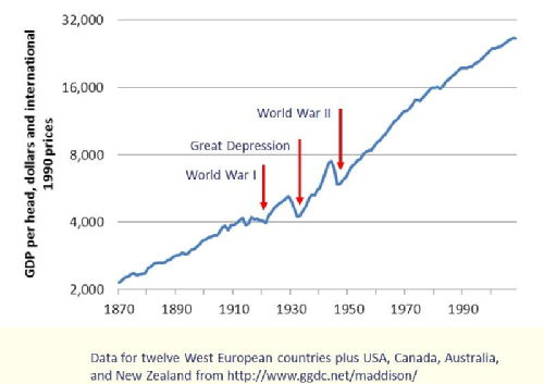 The opposite happened. The economy took off (see graph). Why? Soldiers who came home played catch-up — there was a baby boom, housing boom, everything boom…demand soared.