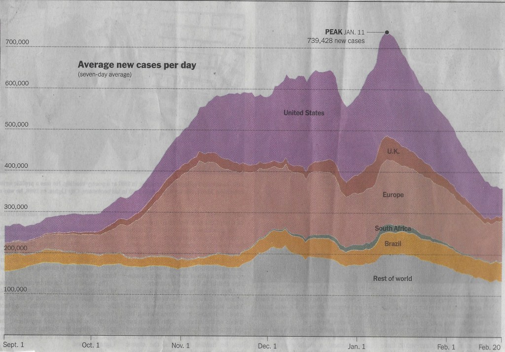 Today’s New York Times (international edition) brings a hopeful graph. Globally, new cases of COVID-19 are declining.