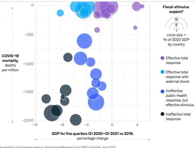 McKinsey, global consulting company, provides a stsriking graph that summarizes global experience over the past five quarters, in combating COVID-19 and in resuscitating the economy. [1]