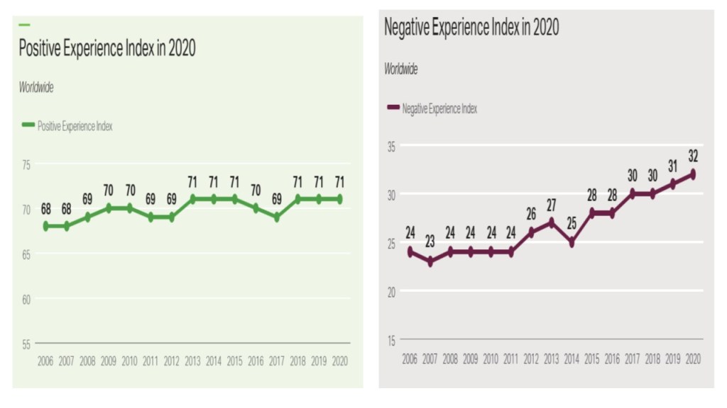 Here is what Gallup concludes: “2020 may eventually go down in history as one of the worst years ever, but the results on Gallup’s Positive Experience Index suggest many people remained resilient through the planet’s dark days…. Providing evidence of people’s resiliency, the results on most of these items changed very little from the previous year. People were just as likely to say that, during a lot of the preceding day, they experienced enjoyment, felt treated with respect and learned something interesting, with the percentage who said they felt well-rested even increasing one point.”