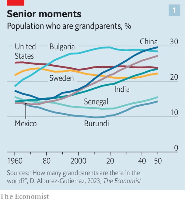 “We found that there are 1.5bn grandparents in the world, up from 0.5bn in 1960 (though the further back one goes, the fuzzier the estimates become). As a share of the population they have risen from 17% to 20%. And the ratio of grandparents to children under 15 has vaulted from 0.46 in 1960 to 0.8 today. By 2050 we project that there will be 2.1bn grandparents (making up 22% of humanity), and slightly more grandparents than under-15s. That will have profound consequences.”