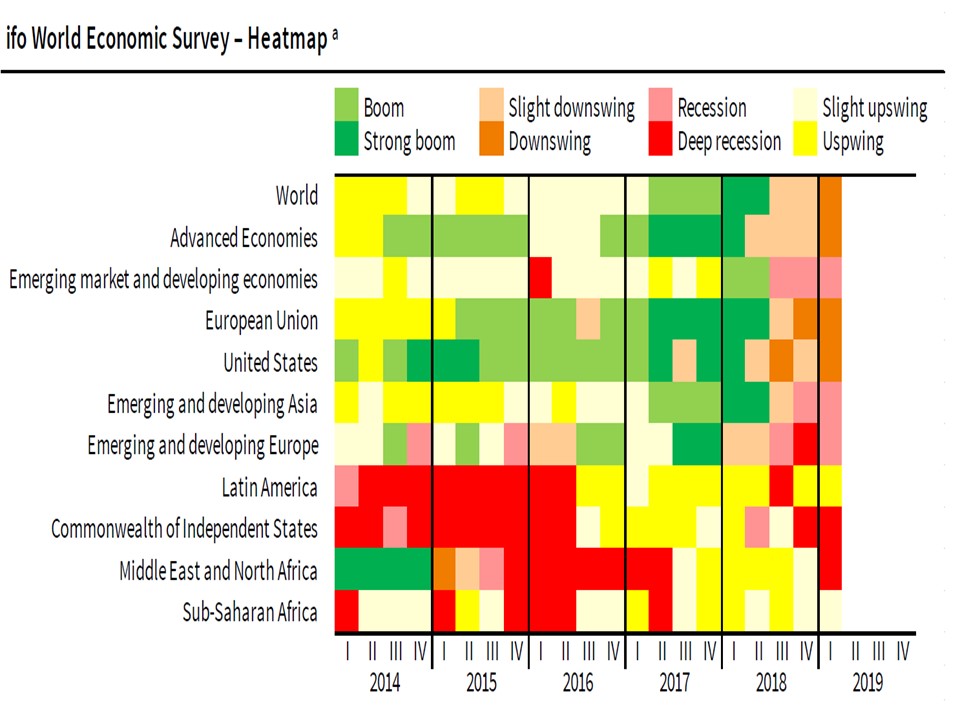 The heat map shown above indicates whether economies are booming green or slowing yellow, orange, light red, dark red.