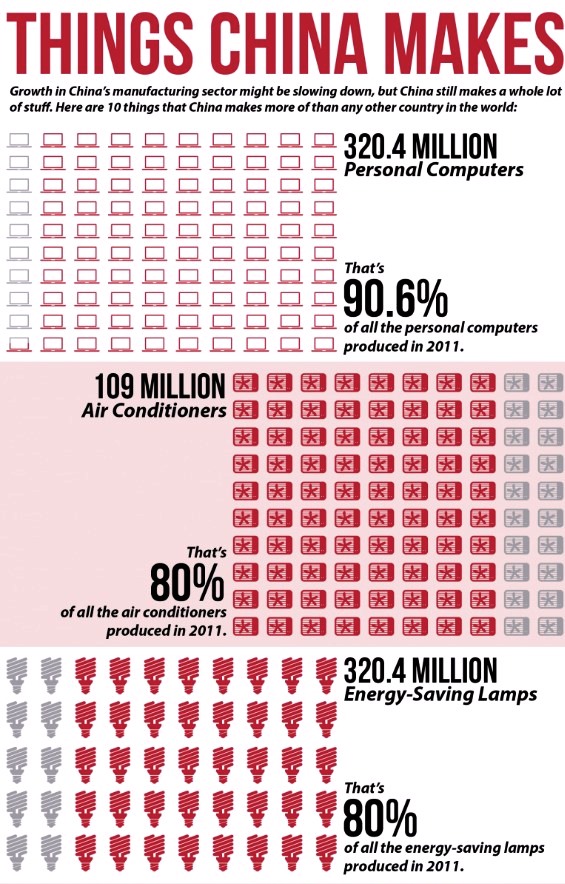● China makes 109 m. air conditioners (80% of world output), 320 m. energy-saving lamps (also 80% world market share), 21.8 gigawatts of solar cell production capacity (74% of global market),