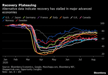 “The recovery has stalled in major advanced economies, with some countries hitting a ceiling on activity that is below their pre-crisis levels, according to Bloomberg Economics gauges that integrate high-frequency data such as credit-card use, travel and location information. Euro-area economies such as Germany, France and Italy, along with Norway and Japan, are closest to their pre-pandemic readings, with Spain falling behind slightly. The U.K., U.S. and Canada are still far below their levels of activity at the start of the year”.